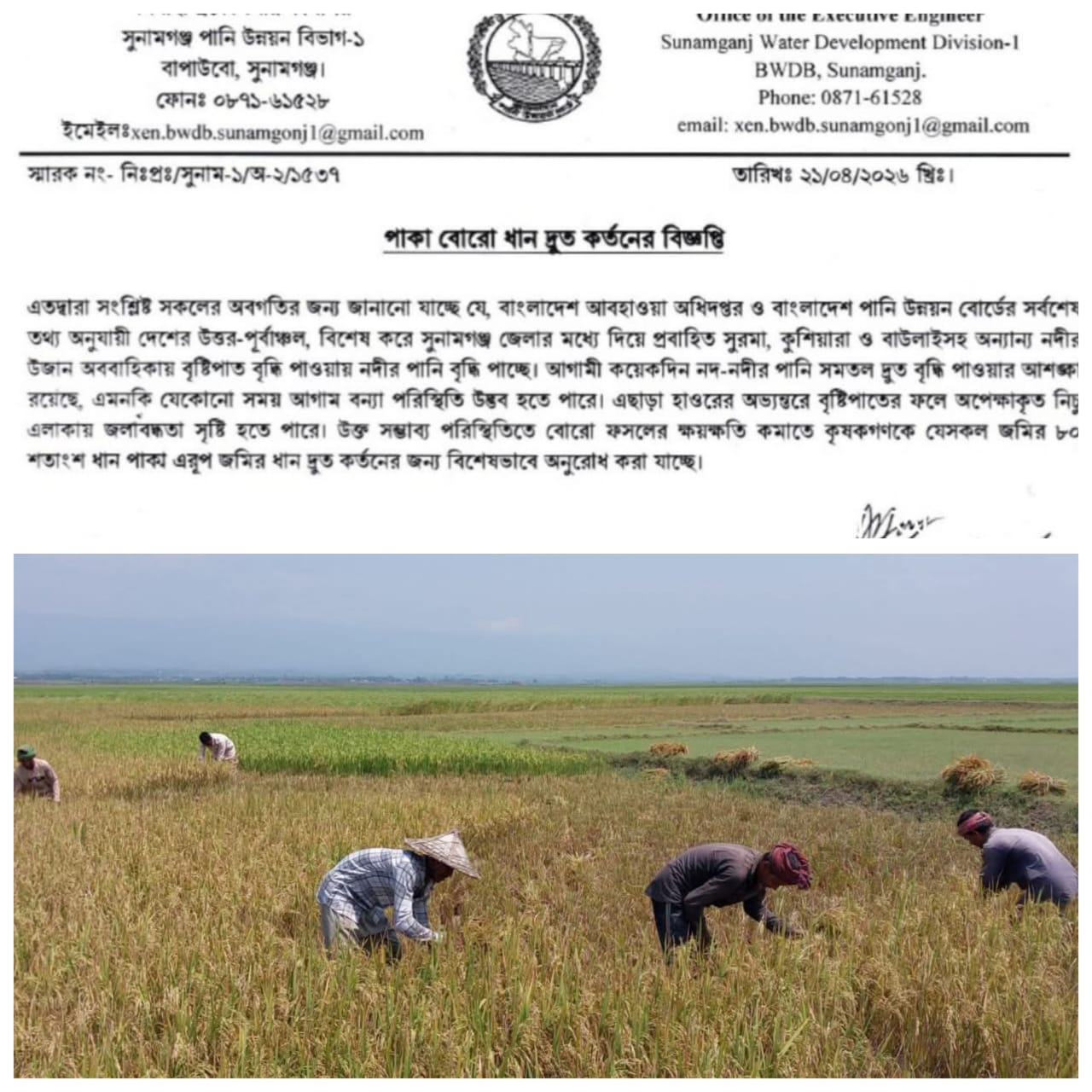 উজানে টানা বৃষ্টিপাত অব্যাহত থাকায় সুনামগঞ্জ জেলার প্রধান নদ-নদীর পানি দ্রুত বৃদ্ধি পাচ্ছে। এতে করে জেলায় আগাম বন্যা পরিস্থিতি তৈরি হওয়ার আশঙ্কা দেখা দিয়েছে। সম্ভাব্য ক্ষয়ক্ষতি এড়াতে কৃষকদের দ্রুত ধান কাটার আহ্বান জানিয়েছে পানি উন্নয়ন বোর্ড (পাউবো)।