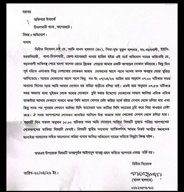 শপিং মলের মালিক মানস হালদার বলেন’ কিছু দিন ধরে আমার শপিং মলের আশেপাশে অজ্ঞাত লোক সন্দেহজনক পরিস্থিতিতে ঘোরাফেরা করে আসছে। গত ০৭/০৪/২৬ তারিখ রাত ৭.০০ ঘটিকায় সময় অন্যান্য সময়ের ন্যায় আমি প্রতিষ্ঠান বন্ধ করে বাড়ি যাই। একই সময়ে রাত ০৭:৫৩ মিনিটে দু’জন অজ্ঞাত লোক আমার প্রতিষ্ঠান চুরি করার উদ্দেশ্যে আসিয়া এদিক ওদিক তাকাতে থাকে। অতঃপর দোকানে লাগানো সিসি ক্যামেরা চুরি করার মিশন নেয়। কিন্তু সিসি ক্যামেরা চুরি করতে ব্যর্থ হলে সব ক্যাবল খুলে ফেলে। এক পর্যায়ে আশেপাশের লোকজনের উপস্থিতি দেখতে পেরে তারা দ্রুত স্থান ত্যাগ করে। আমি প্রতিদিনের ন্যায় সকাল ১০ ঘটিকায় প্রতিষ্ঠানে এসে দেখি সিসি ক্যামেরার সকল সরঞ্জামাদি এলোমেলো এবং দেরি না করে এলাকার লোকজনদের অবগত করি। বিষয়টি গণ্যমান্য ব্যক্তিবর্গ ও আমার নিকট লোকজনের সাথে আলোচনা করে তদন্তমূলক -আইনানুগ ব্যবস্থা গ্রহণের জন্য চিতলমারী থানায় একটি সাধারণ অভিযোগ দায়ের করি।