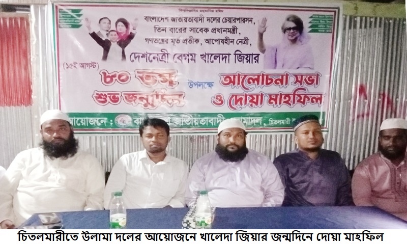 বাংলাদেশ জাতীয়তাবাদী দল (বিএনপি)-এর চেয়ারপারসন ও সাবেক প্রধানমন্ত্রী দেশনেত্রী বেগম খালেদা জিয়ার ৮০তম জন্মদিন উপলক্ষে বাগেরহাটের চিতলমারী উপজেলা উলামা দলের আয়োজনে আলোচনা সভা ও দোয়া মাহফিল অনুষ্ঠিত হয়েছে।