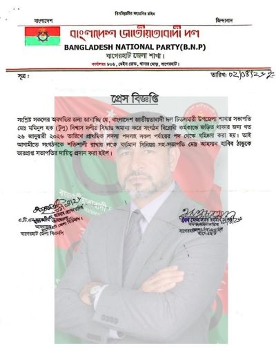 প্রেস বিজ্ঞপ্তি সূত্রে জানা যায়, দলীয় সিদ্ধান্ত অমান্য ও সংগঠনবিরোধী কর্মকাণ্ডে জড়িত থাকার অভিযোগে গত ২৬ জানুয়ারি ২০২৬ ইং তারিখে মমিনুল হক টুলু বিশ্বাসকে দলের প্রাথমিক সদস্যপদসহ সকল পর্যায়ের পদ থেকে বহিষ্কার করা হয়।