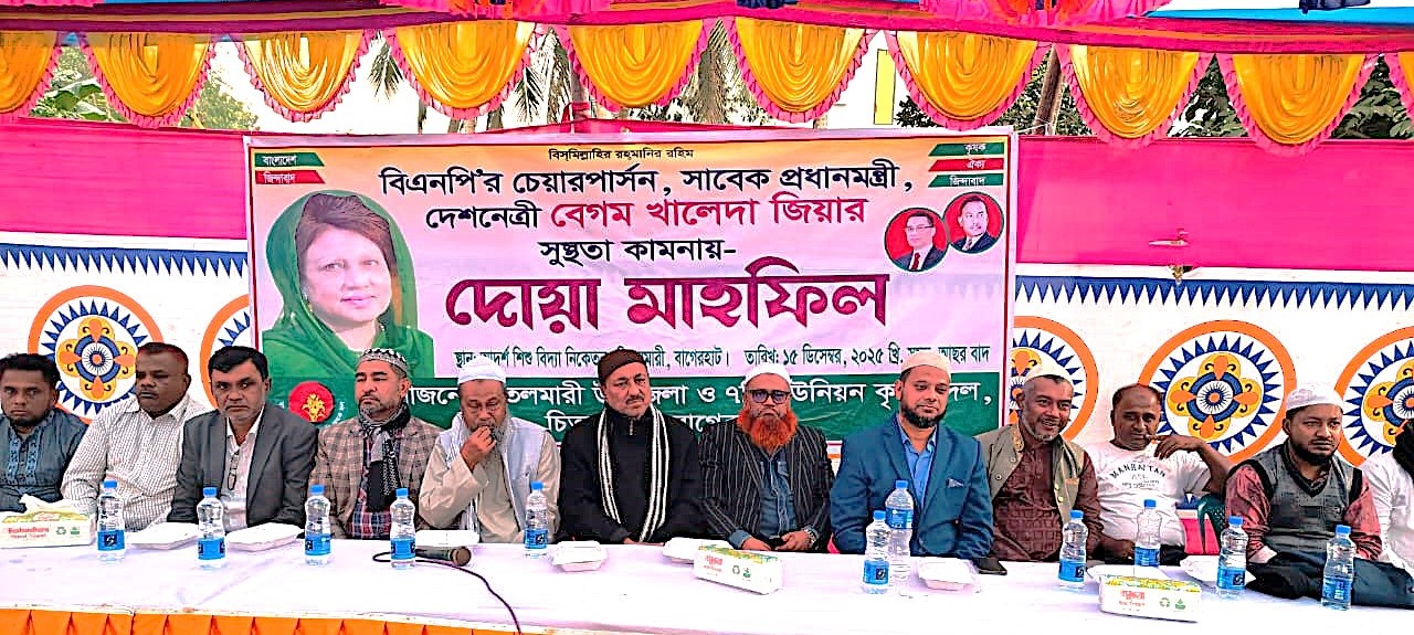 বিএনপির চেয়ারপার্সন, সাবেক প্রধানমন্ত্রী ও দেশনেত্রী বেগম খালেদা জিয়ার দ্রুত রোগমুক্তি, পূর্ণ সুস্থতা ও দীর্ঘায়ু কামনায় বাগেরহাটের চিতলমারী উপজেলায় ধর্মীয় ভাবগাম্ভীর্যের মধ্য দিয়ে এক দোয়া মাহফিল অনুষ্ঠিত হয়েছে।