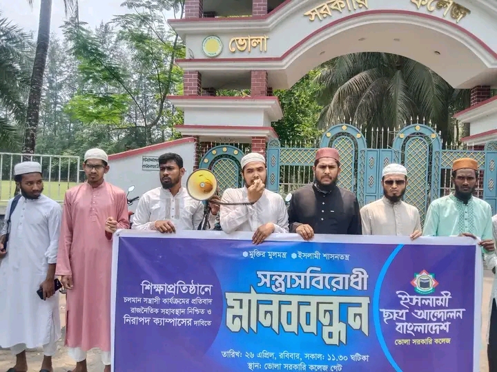ভোলা সরকারি কলেজে নিরাপদ ক্যাম্পাসের দাবিতে ইসলামী ছাত্র আন্দোলন বাংলাদেশ-এর সন্ত্রাসবিরোধী মানববন্ধন অনুষ্ঠিত