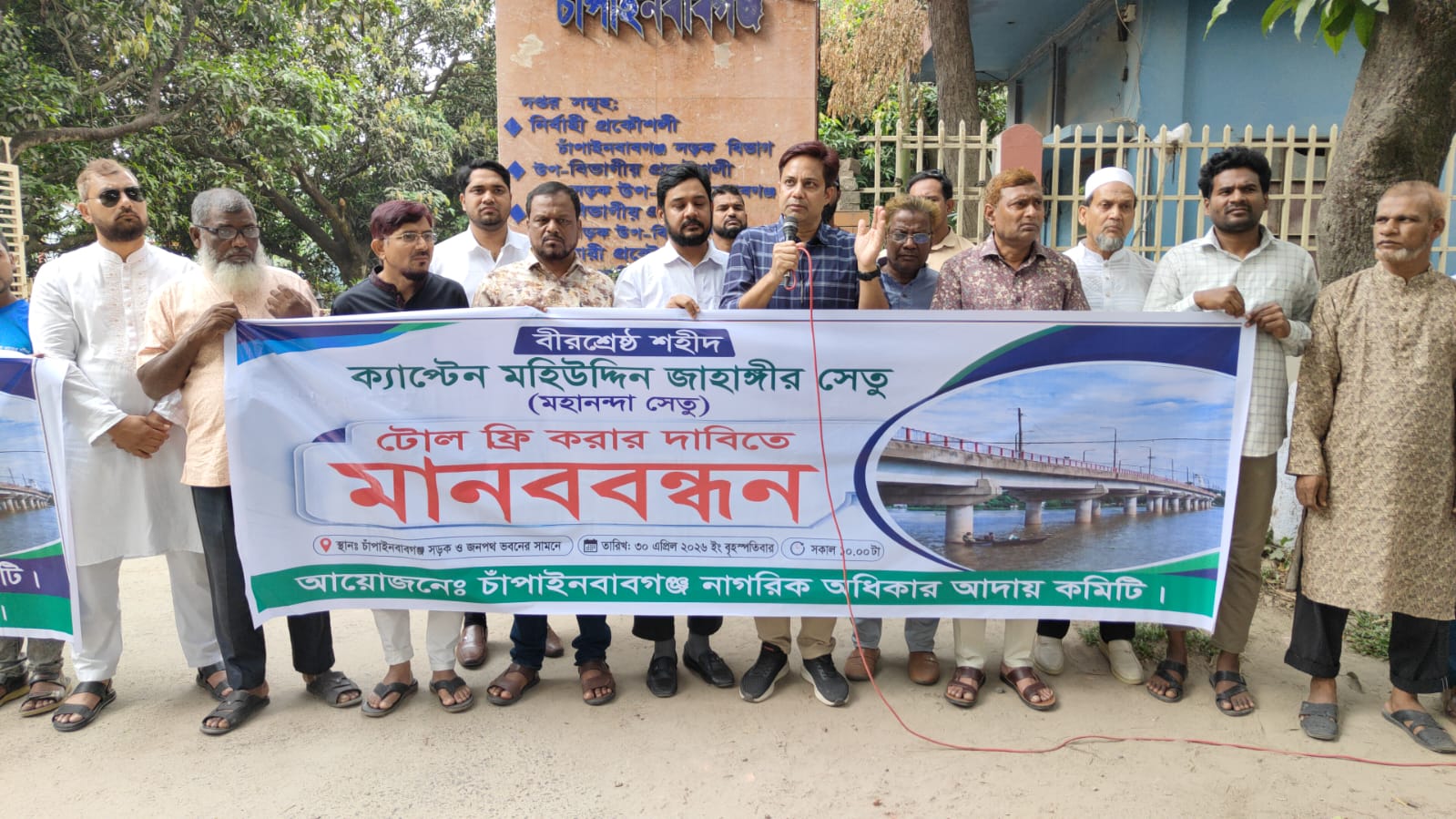 চাঁপাইনবাবগঞ্জের বীরশ্রেষ্ঠ শহীদ ক্যাপ্টেন মহিউদ্দিন জাহাঙ্গীর (মহানন্দা) সেতুতে দীর্ঘ ৩৩ বছর ধরে চলমান টোল আদায় বন্ধের দাবিতে মানববন্ধন অনুষ্ঠিত হয়েছে। বৃহস্পতিবার (৩০ এপ্রিল) সকালে চাঁপাইনবাবগঞ্জ সড়ক ও জনপথ (সওজ) ভবনের সামনে *’চাঁপাইনবাবগঞ্জ নাগরিক অধিকার আদায় কমিটি’*র ব্যানারে এ কর্মসূচি পালন করা হয়।